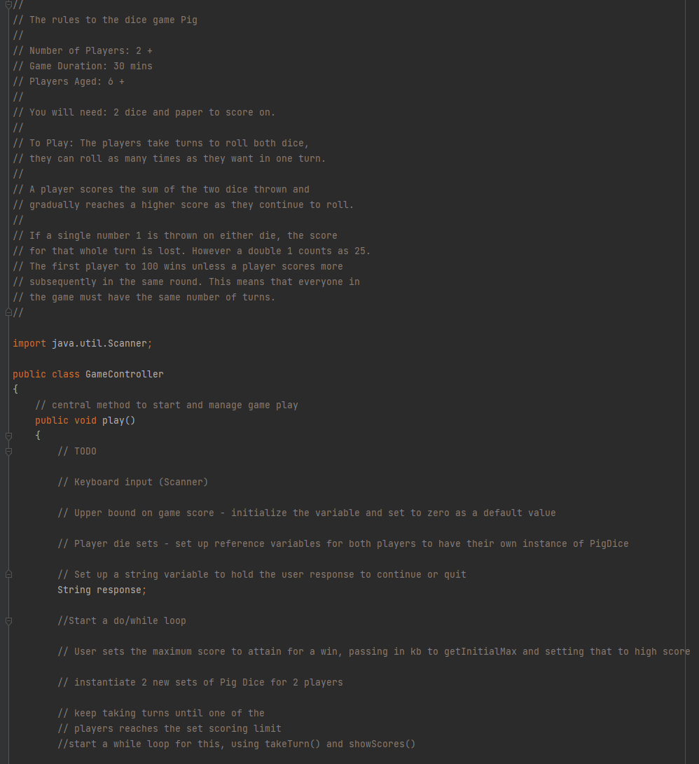 Instantly share code notes and snippets. Java Programming - Creating the Pig Dice Game from the ground up. A version of the dice game Pig The object of the game is to be the first to score 100.